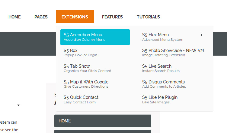 The S5 Flex Menu system is a very powerful plugin that provides functionality far beyond what the standard Joomla menu system can provide. This plugin is intended to be as an extension of the existing menu system in Joomla to add many new features! Please see the full list of features below.